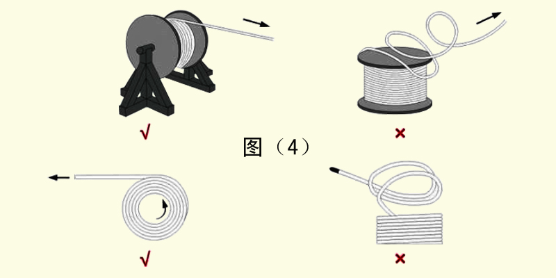 5、拖鏈電纜在敷設(shè)中不能扭曲,即不可直接從電纜卷筒或電纜盤上拉出,而應(yīng)旋轉(zhuǎn)短筒或者電纜盤將電纜展開。如圖(4)