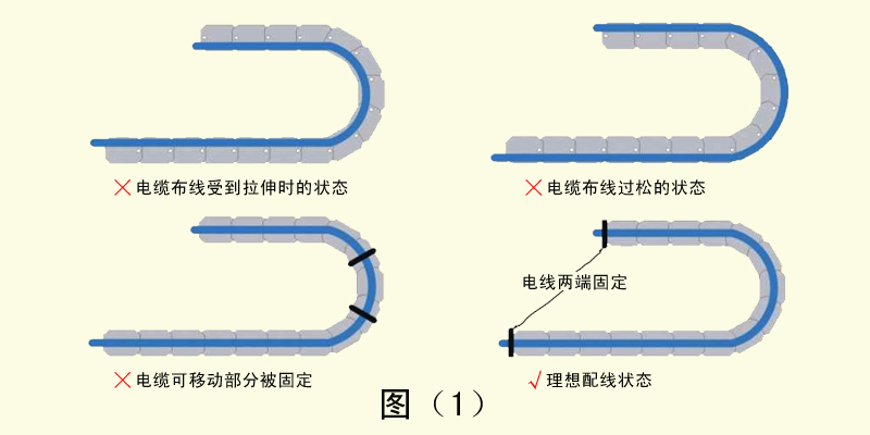 2、如果電纜在布線時愛到張力拉伸,會與拖鏈內(nèi)壁產(chǎn)生摩擦導(dǎo)致護套磨損。反之如果布線過于松散,同樣會與拖鏈的內(nèi)壁產(chǎn)生摩擦造成護套磨損,并且容易與其他電纜產(chǎn)生纏繞現(xiàn)象。電纜的布線長度應(yīng)設(shè)定在剛好能通過拖鏈的中心線宜。電纜的移動部分如果被固定,會導(dǎo)致彎曲應(yīng)力無法被分散和吸收,會在固定位置造成應(yīng)力集中。電纜的固定部分應(yīng)設(shè)置在拖鏈的兩端。如圖(1)