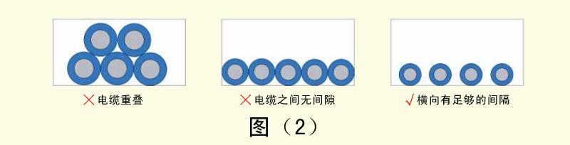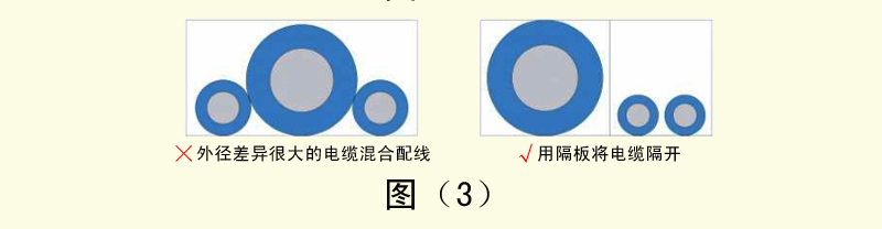 4、外徑差異很大的電纜如果混合配線,容易導(dǎo)致細線被粗線壓迫,造成細線容易斷線。這時需要用隔板將電纜隔開。如圖(3)